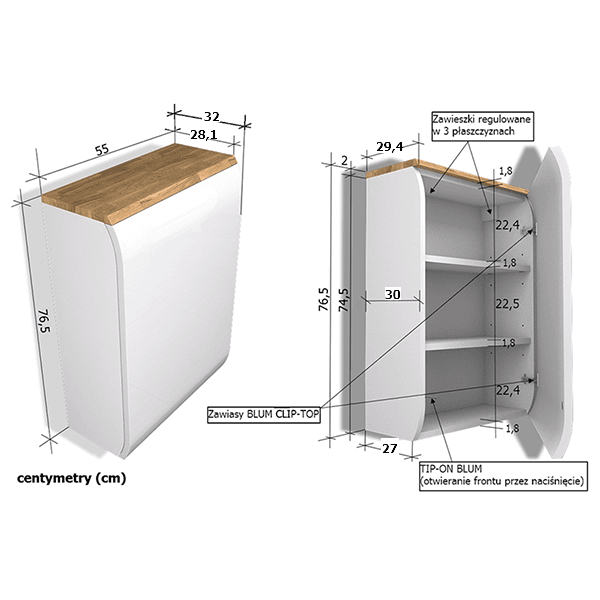 Możliwy montaż kilku szafek w szeregu jak również montaż we wnęce w ścianie. Front podczas otwierania nie zwiększa wymiaru szafki.