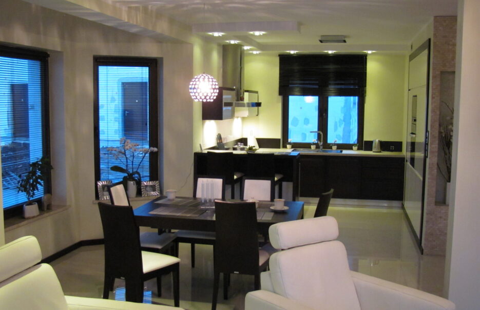 Kuchnia została zaprojektowana z myślą o wygodzie użytkowników. Ergonomiczny układ zabudowy umożliwia sprawne gotowanie i łatwy dostęp do wszystkich stref roboczych. Zastosowane oświetlenie punktowe podkreśla charakter mebli i wydobywa kontrasty kolorystyczne. Detale, takie jak eleganckie uchwyty czy wykończenia w czerni, dodają wnętrzu luksusowego charakteru. Całość harmonijnie łączy się z przestrzenią jadalni i salonu.