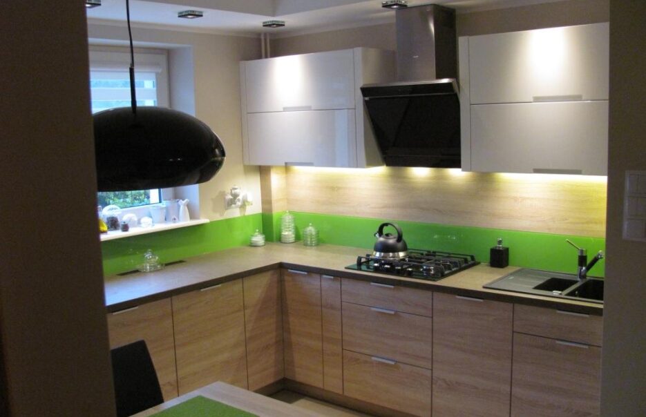 Ta nowoczesna kuchnia łączy w sobie białe, połyskujące fronty z naturalnym dekorem drewna, tworząc lekką i przytulną aranżację. Charakteru dodaje zielony panel nadblatowy, który ożywia przestrzeń i przełamuje neutralną bazę.