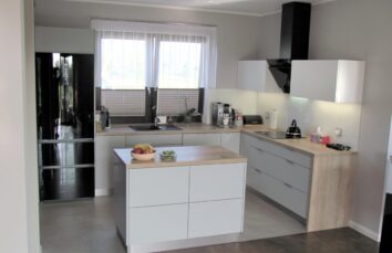 Ta kuchnia z wyspą to przykład funkcjonalnego i estetycznego wnętrza, w którym naturalne drewno spotyka się z nowoczesnymi wykończeniami. Projekt łączy minimalizm i praktyczne rozwiązania, które idealnie sprawdzą się w codziennym użytkowaniu.