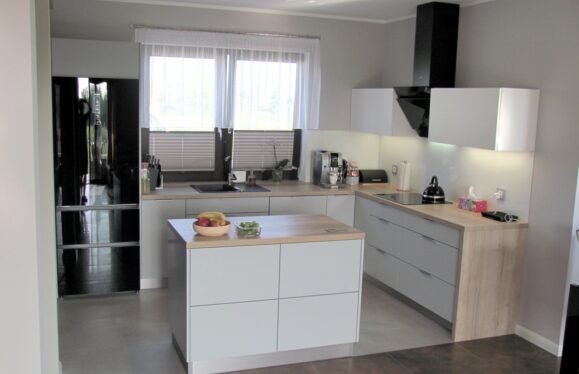 Nowoczesna kuchnia z wyspą i drewnianymi akcentami – KN_MLY