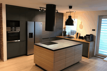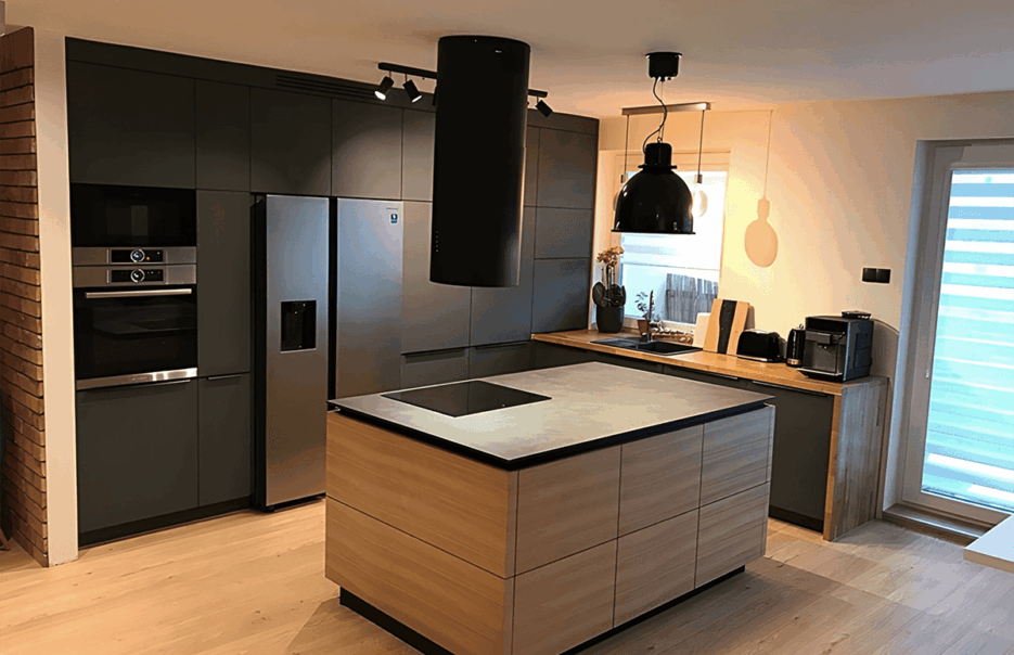Realizacja kuchni na wymiar w stylu nowoczesnym. Połączenie matowych grafitowych frontów z ciepłym drewnem i funkcjonalną wyspą.